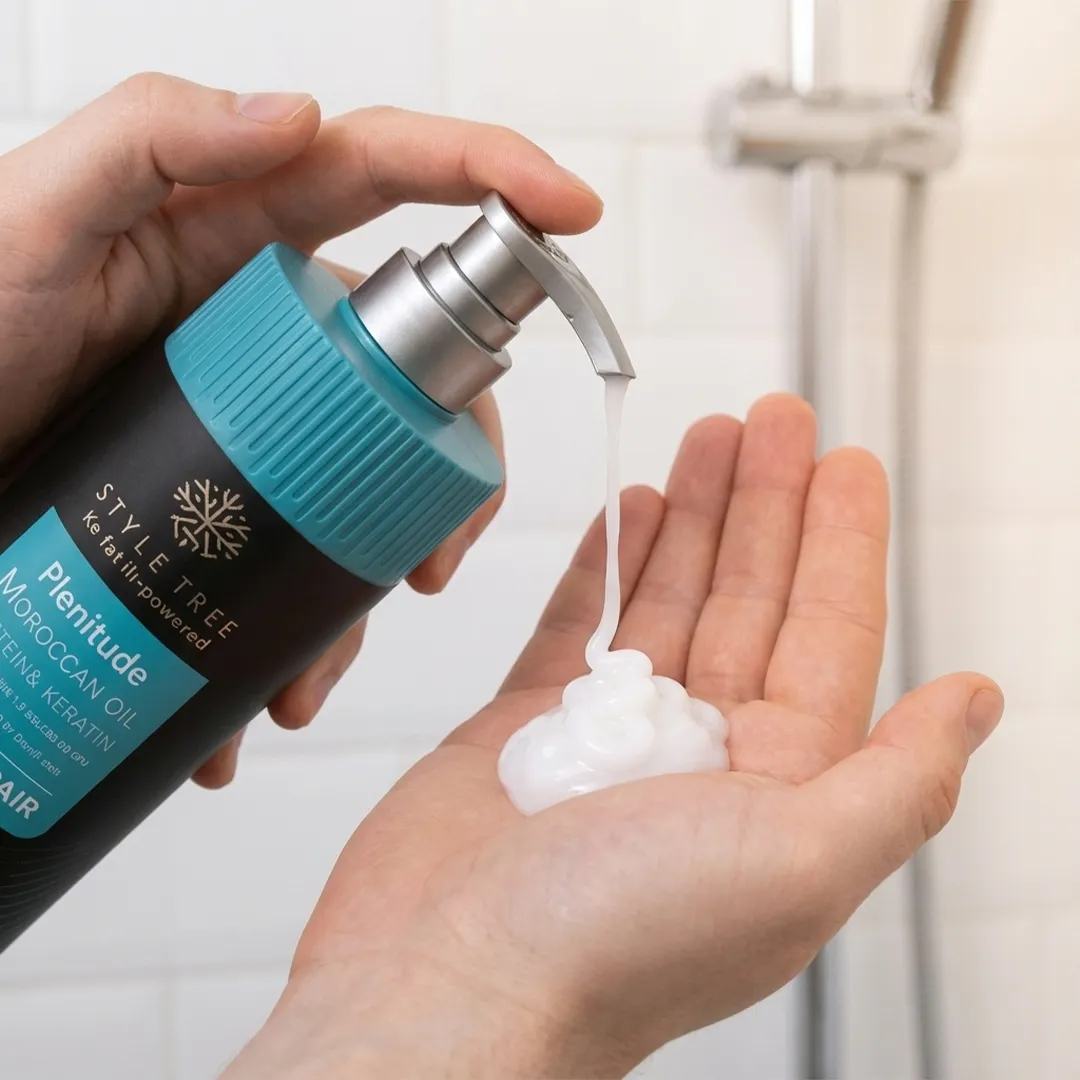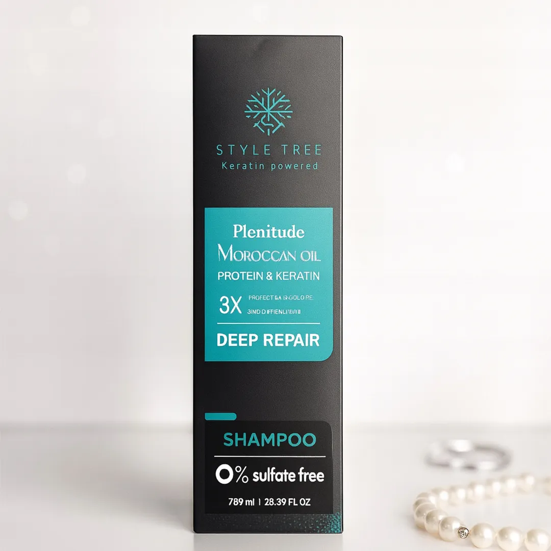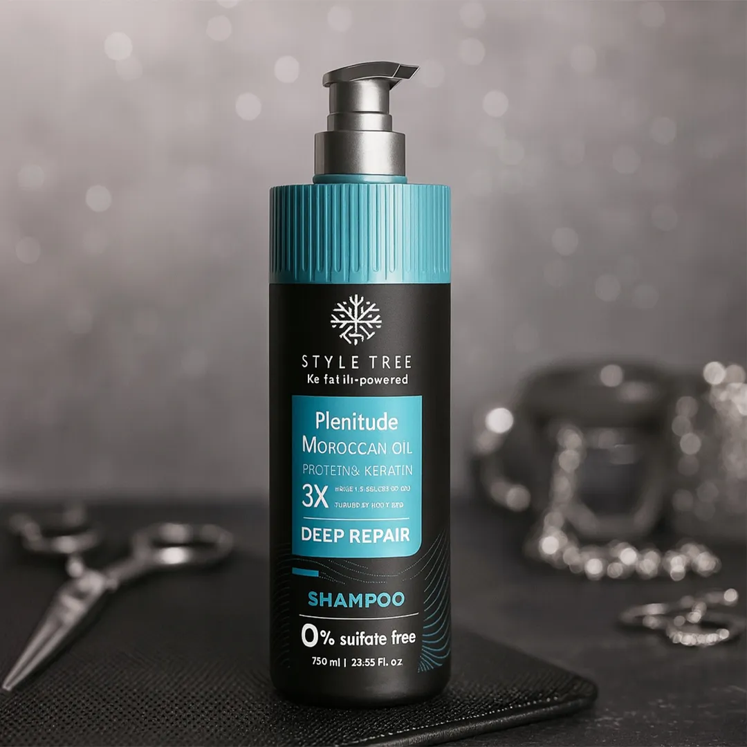 Style Tree Plentitude Moroccan Oil Deep Repair Shampoo is a sulfate-free cleansing shampoo enriched with Moroccan oil, protein, and keratin to help repair, strengthen, and smooth damaged hair. Ideal for dry, frizzy, or color-treated hair, it gently cleanses while restoring softness, shine, and manageability.